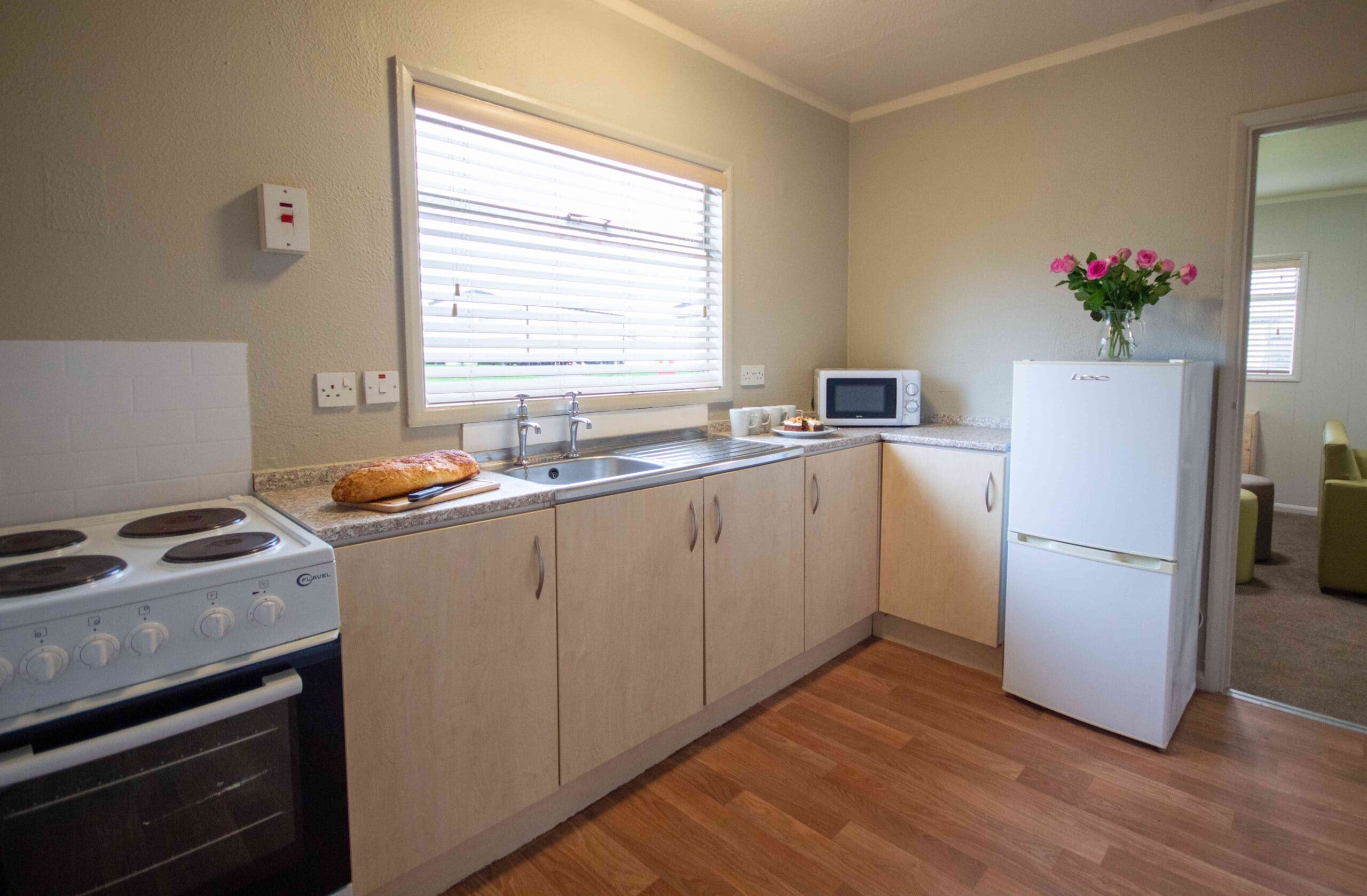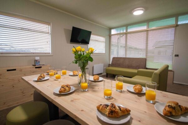This Chalet is made up of 4 bedrooms, 2 double and 2 twin, plus extra sleeping space for 2 in the living area. The living/dining room is separate to the kitchen, and there’s a bathroom with bath, sink and toilet, plus an additional shower room and separate toilet.